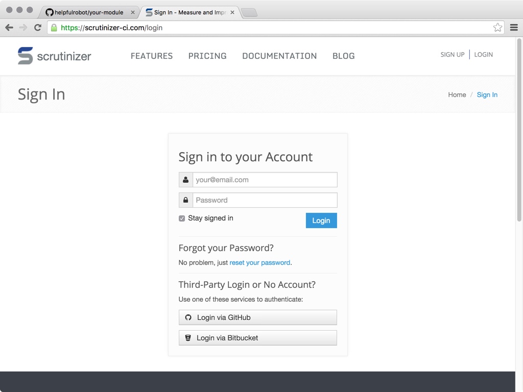 Then, sign in to Scrutinizer. You can do this with your Github account, so you don't have to remember additional, pesky account credentials. I know you humans struggle with that sort of thing...