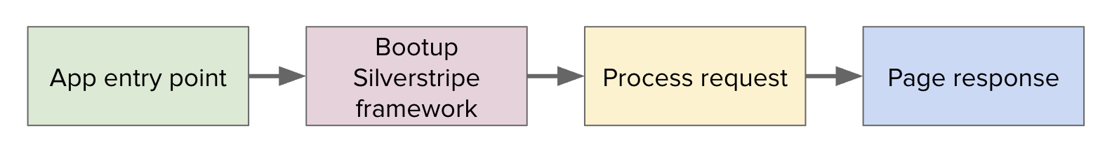 We have your application entry point here which is usually index.php. Silverstripe framework gets booted up. The request is processed (which is where most of the functionality - and response time - lies). Finally you get your page response.