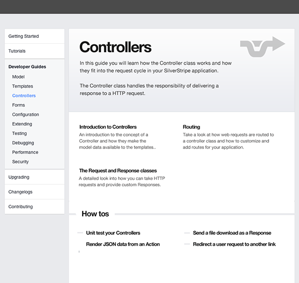 Each guide is focused around a topic such as Models, Testing and Security to name a few. Topics will have a basic introduction then break down into reference material and specific how-to code examples. Long winded documentation pages will be logically broken up into more manageable pages with an improved user interface for moving sequentially through a section of the guides available.