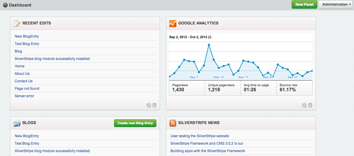 When I started building the Dashboard module, I knew the last thing I wanted was to offer a handful of static widgets that may or may not serve each user’s needs. Rather, like the SilverStripe platform itself, it should offer just enough out of the box, and invite developers to create custom solutions. Knowing that every developer understood the basic design pattern of creating a custom page type, I followed that template and offered an API that gave dashboard panels their own model, view, and controller. This means that each dashboard panel is self-contained and can render virtually anywhere, with any content you want it to.