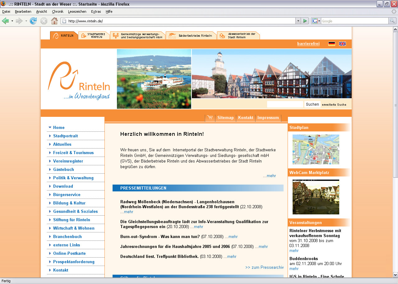 The official Site of the german town Rinteln with lots of functionalities including xml apis to the lower saxony state portal and many more egovernment features